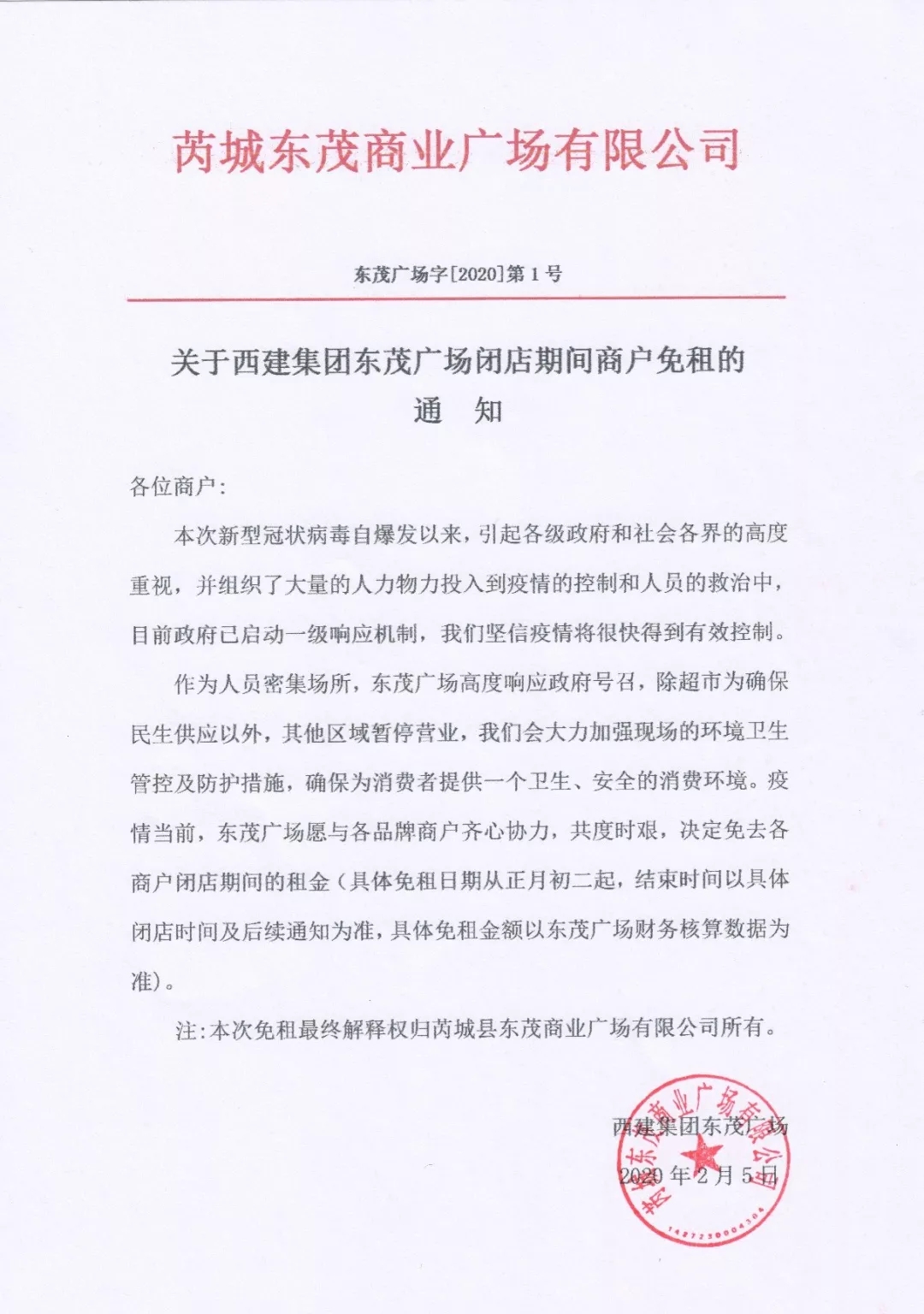 作為人員密集場所,隸屬西建集團旗下的芮城縣東茂廣場高度響應政府號召,除超市為確保民生供應以外,其他區域已全部暫停營業,大力加強現場的環境衛生管控及防護措施,確保為消費者提供一個衛生、安全的消費環境。疫情當前,總公司從目前形勢出發,決定免去各商戶閉店期間的租金,與眾商戶齊心協力,共克時艱。