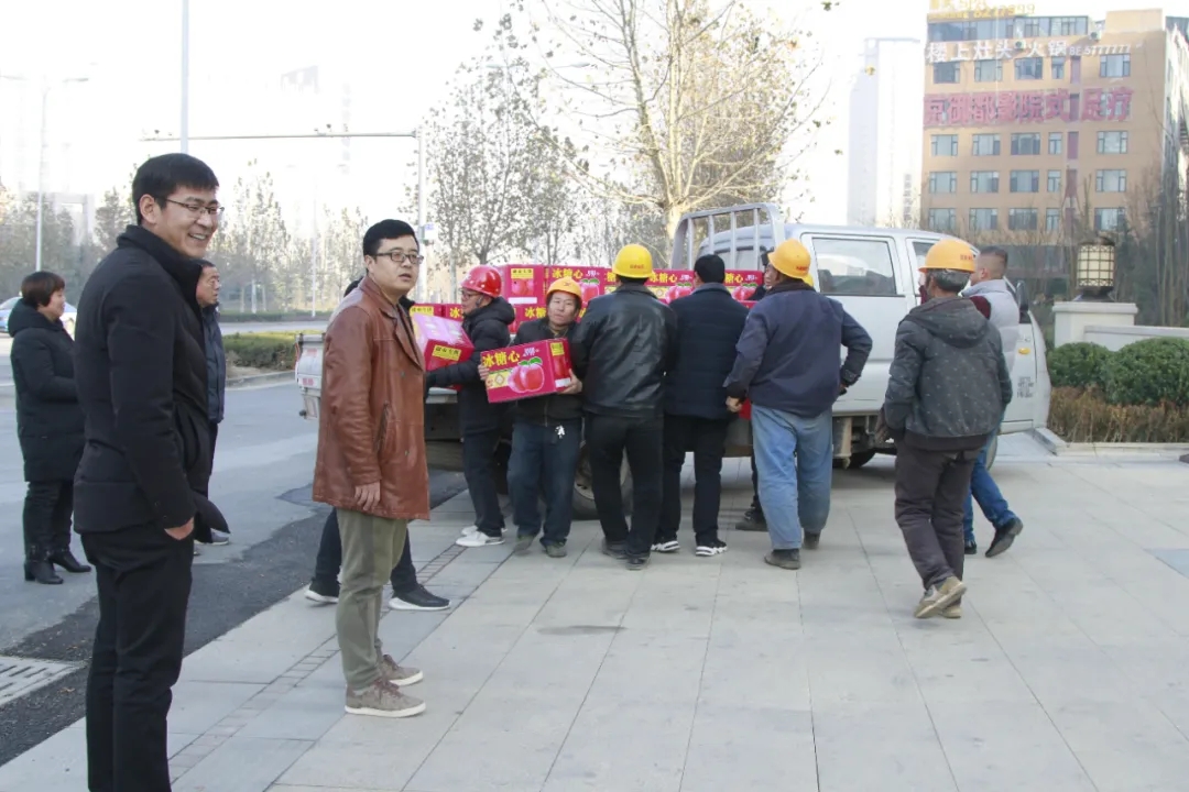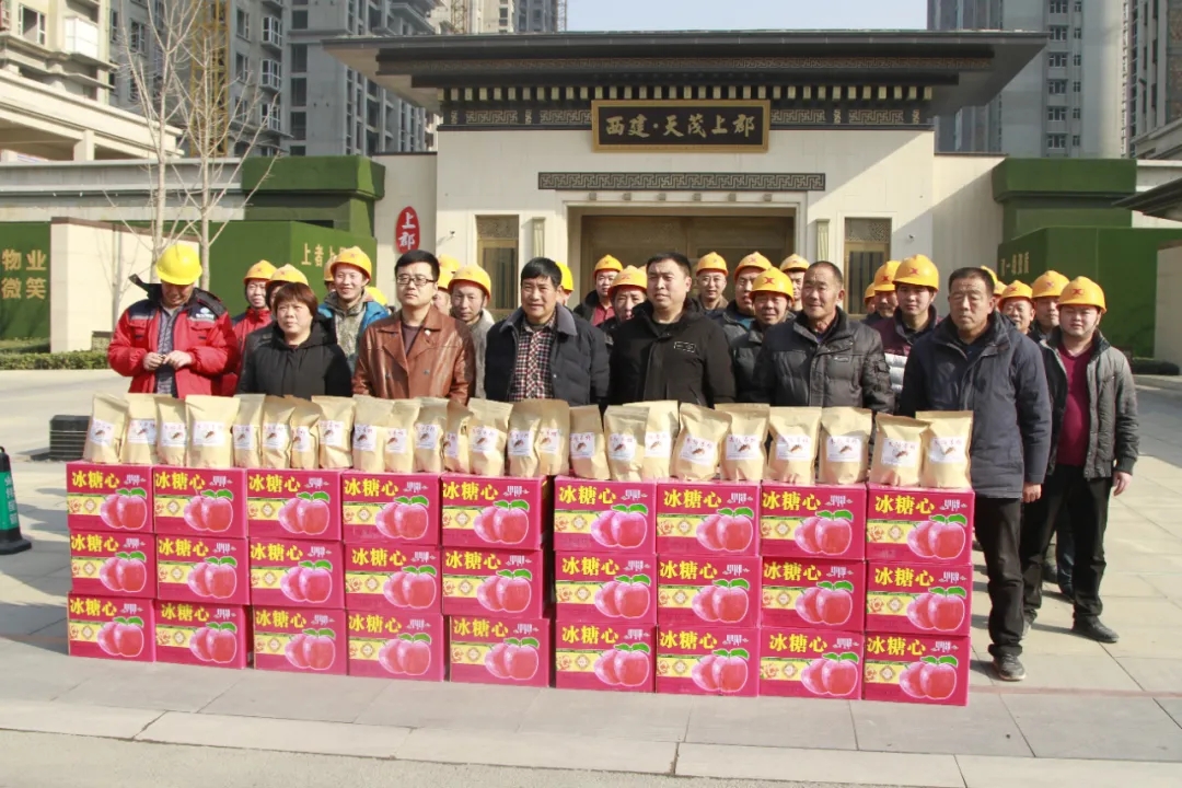 天茂房產(chǎn)分公司總經(jīng)理劉忠森接過村干部帶來的柿餅,拆了一袋,分給現(xiàn)場的員工們,高興的說:“這是我們家鄉(xiāng)的柿餅,大家都應(yīng)該嘗一嘗。”他說“非常感謝朱陽村干部們對西建集團(tuán)的認(rèn)可,帶來家鄉(xiāng)的蘋果和柿餅慰問咱們的農(nóng)民工兄弟,讓大家伙心里很暖,寒冬不再冷!”