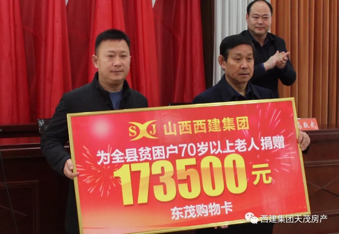 2018年,按照芮城縣委、縣政府的安排,西建集團前往永樂鎮原村精準幫扶兩戶貧困戶脫貧,先后將貧困戶的危房翻修改造,并送去了種羊、樹苗、煤炭促使其脫貧摘帽。同時,積極響應運城市委、市政府“百千百”工程號召,前往平陸縣窯頭村幫扶脫貧,先后出資20余萬元為該村捐物贈款,建廣場及文化活動室,促使該村脫貧摘帽。2019年、2020年春節前夕,集團共出資近40萬元,為芮城縣2000余戶70歲以上的貧困老人贈送購物卡,讓老年人愉快地過好春節。