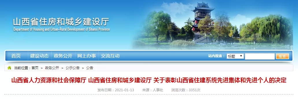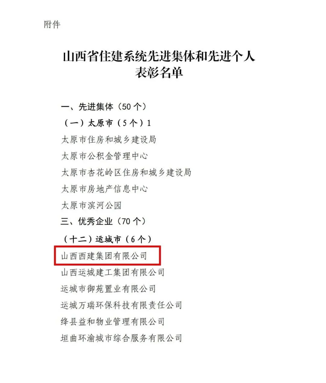 2021113日,山西省人力資源和社會保障廳、山西省住房和城鄉建設廳,在《關于表彰山西省住建系統先進集體和先進個人的決定》中,西建集團被評為“山西省住建系統優秀企業”。