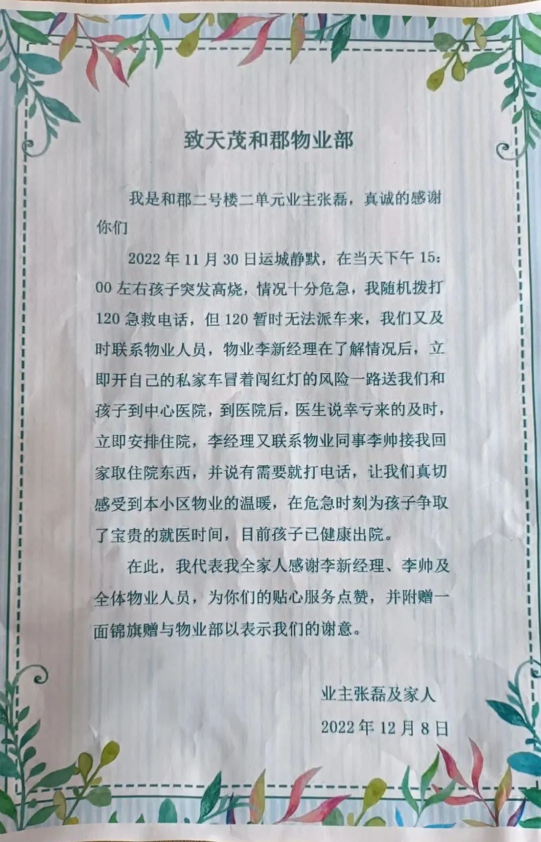 西建·天茂和郡業主張磊孩子突發高燒,在120暫時無法派車的情況下,物業經理迅速用自己的車,冒著闖紅燈的風險將孩子送往醫院,為孩子爭取了寶貴的就醫時間。業主在信里說道:真切感受到物業的溫暖,真誠感謝李新經理、李帥及全體物業人員。