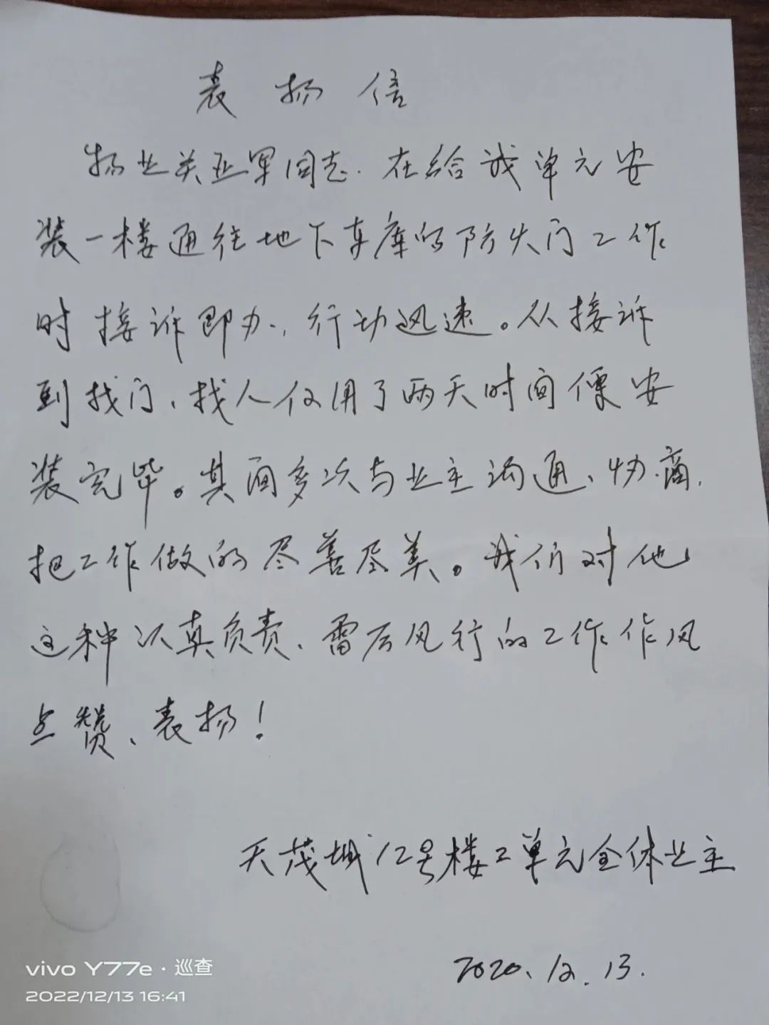 天茂城物業關亞軍,對于小區業主的訴求盡心盡力,行動迅速,關亞軍雷厲風行、盡善盡美的工作作風,獲得了12號樓2單元全體業主的聯名點贊。